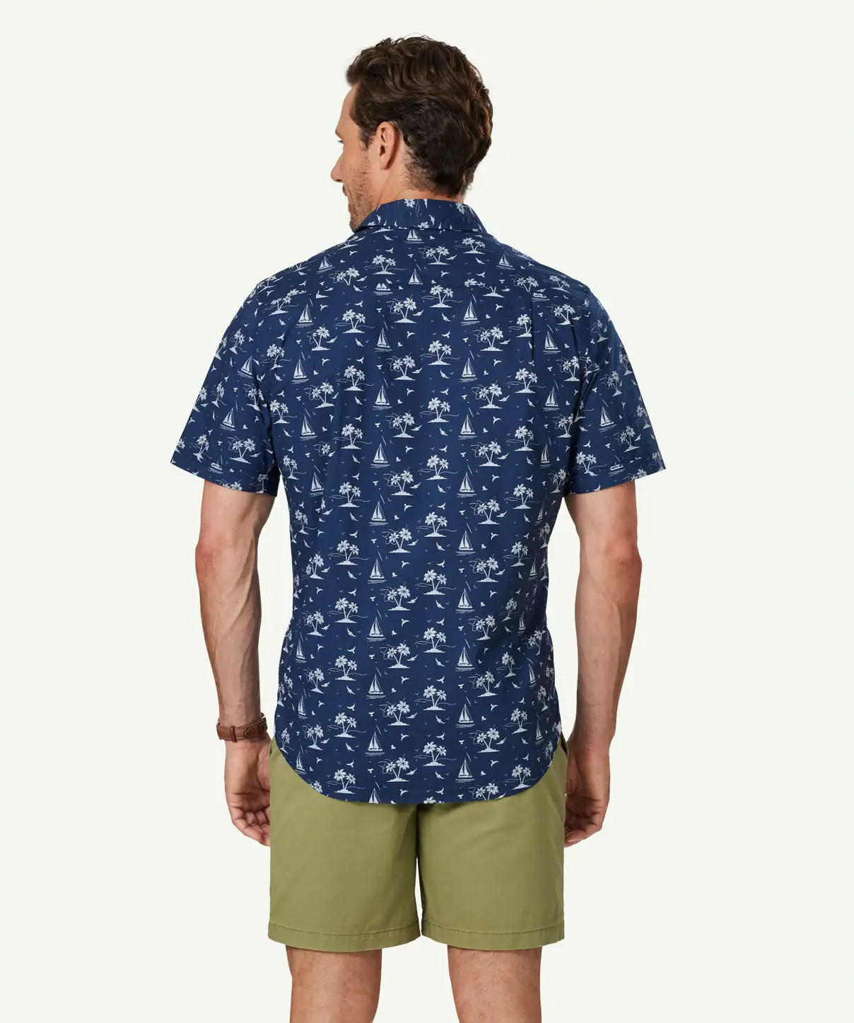 This light weight cotton shirt features a stylish island pattern that makes for a fun and easy weekend option. This regular fitting shirt is made from a soft cotton that pairs well with denim for a casual off duty style.
