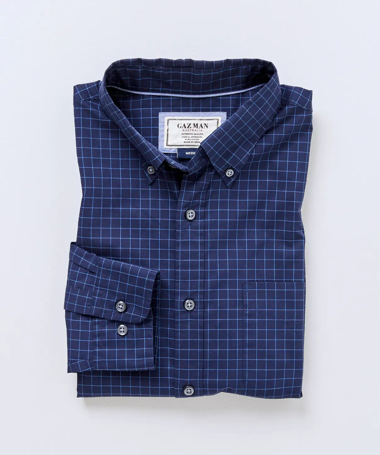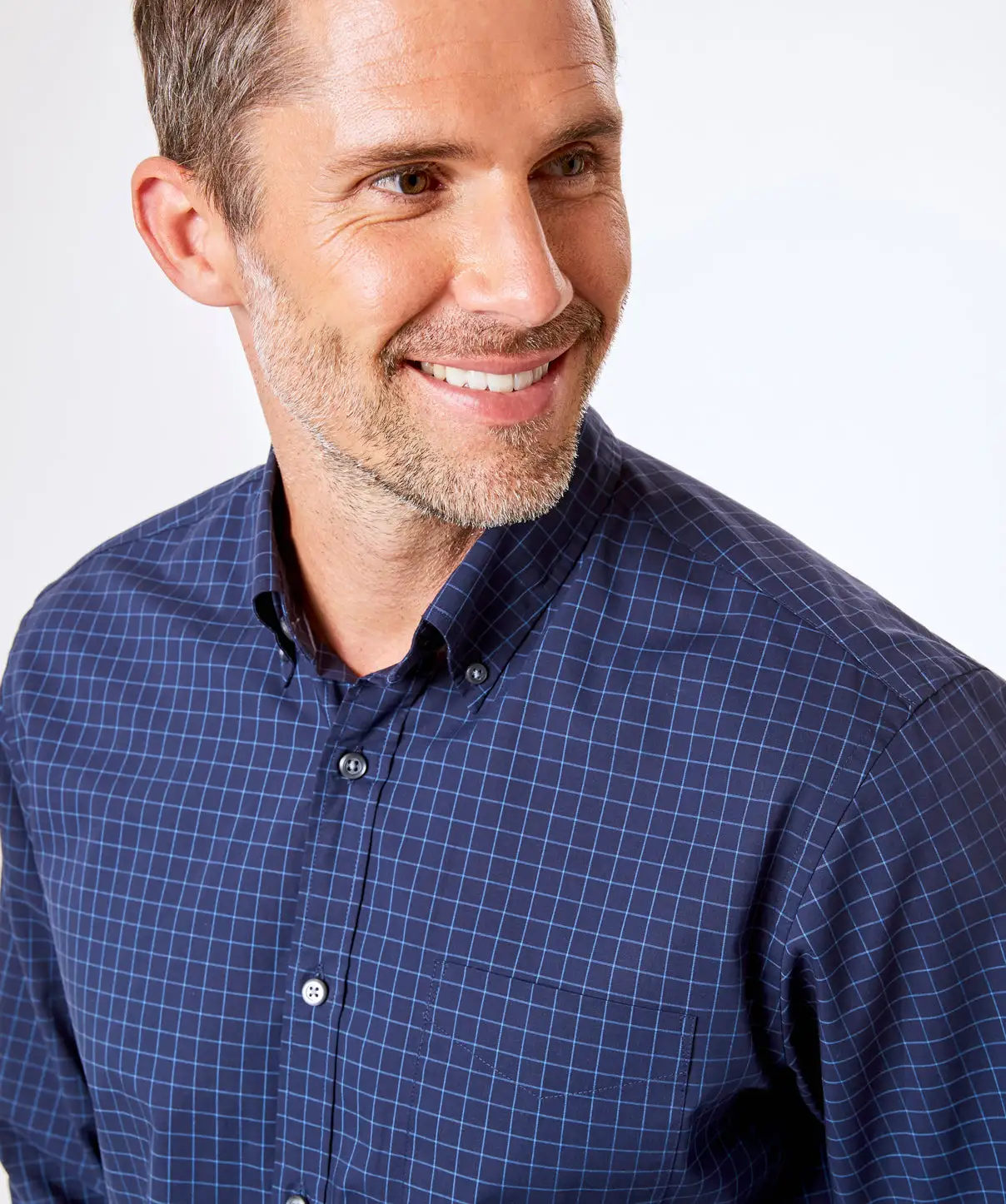 The shirt that moves with you, our poplin check shirt is sure to become a wardrobe staple. With added stretch for extra comfort and cut in a regular fit, this navy checked shirt is perfect for busy days.