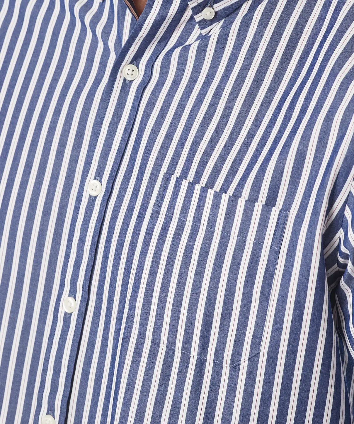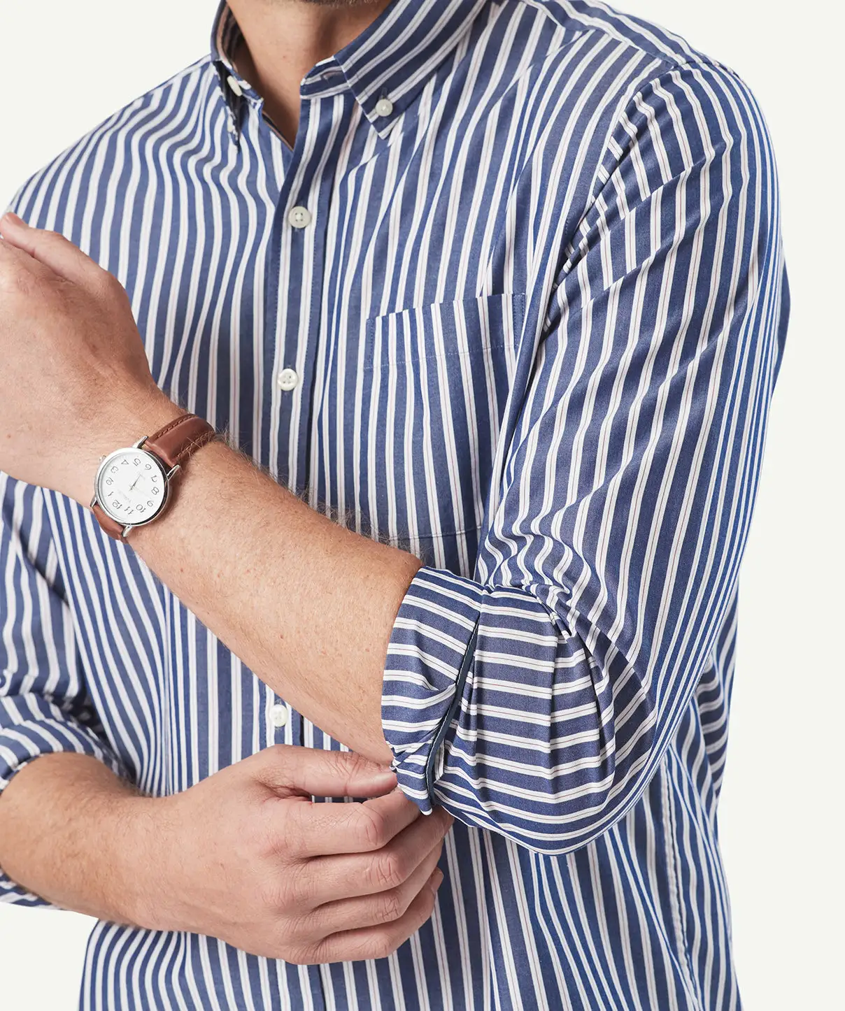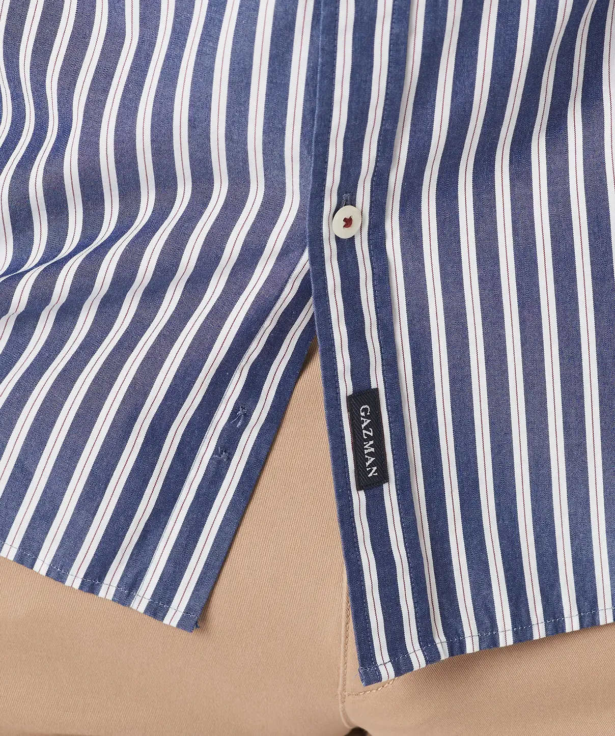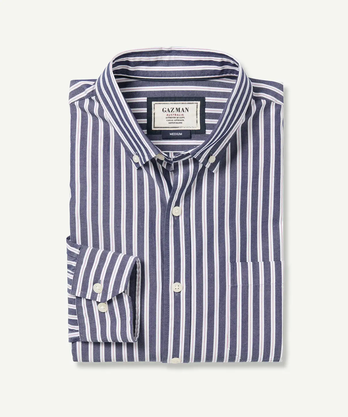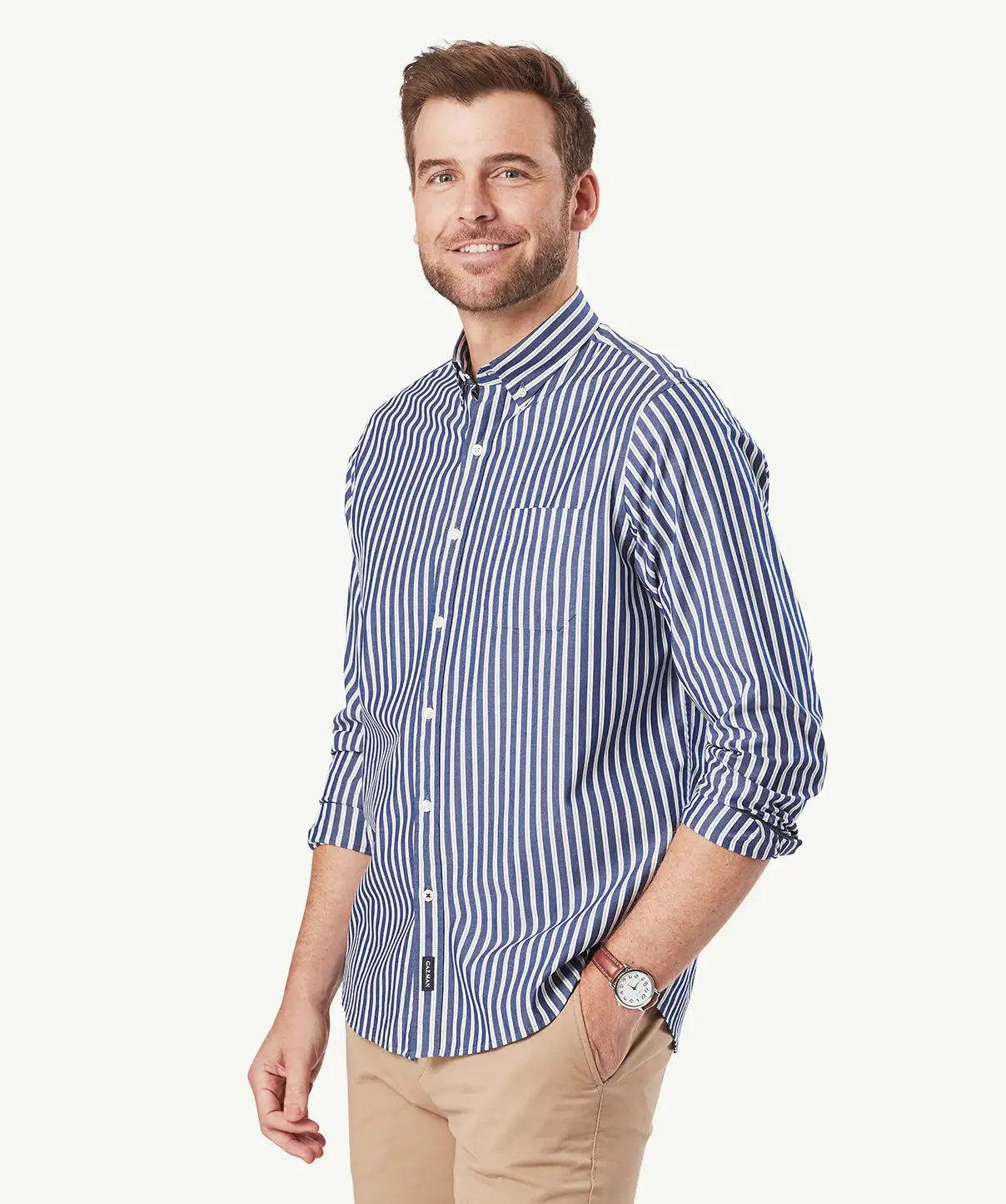 Cut in a regular fit and featuring a chest pocket and removable collar stays, this shirt can be easily styled with any wardrobe. Wear the Navy stripe with denim or a tan chino for easy style.
