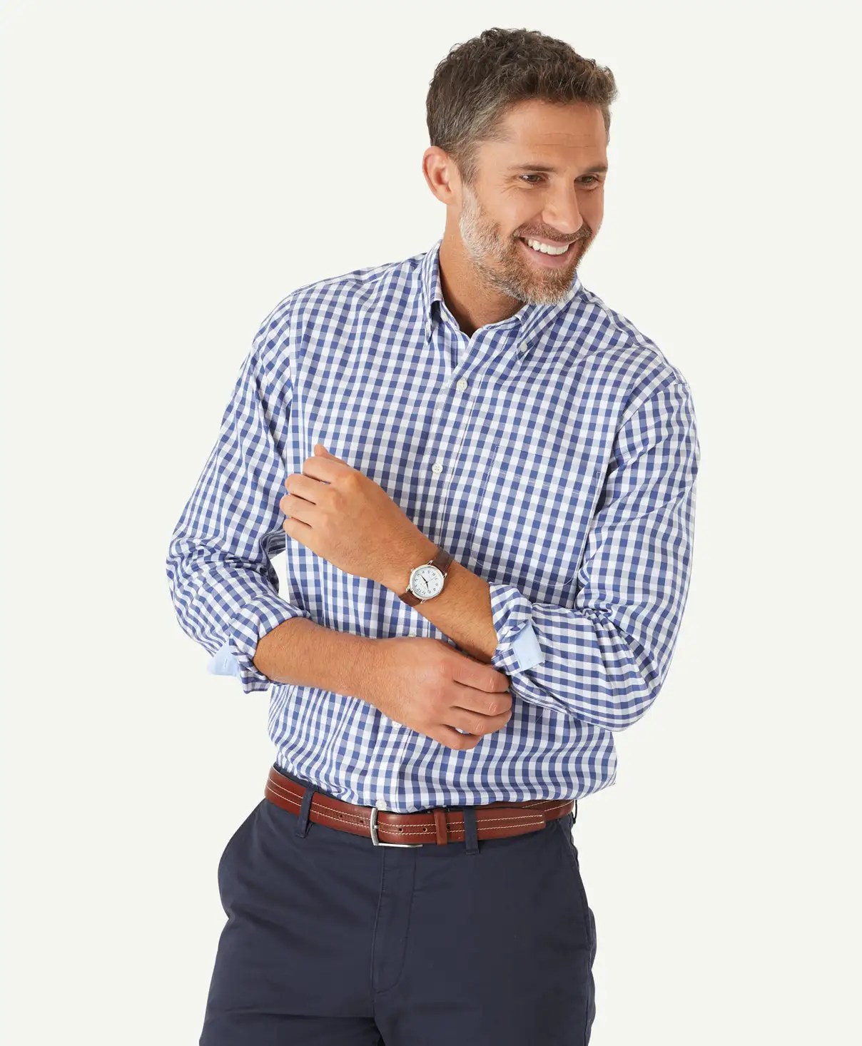 Easy care shirts are designed to help you get out the door quicker. Easy to iron, these shirts are soft to the touch and stay looking fresh all day. In a petrol blue check, this shirt will be an easy option for everyday wear. Â