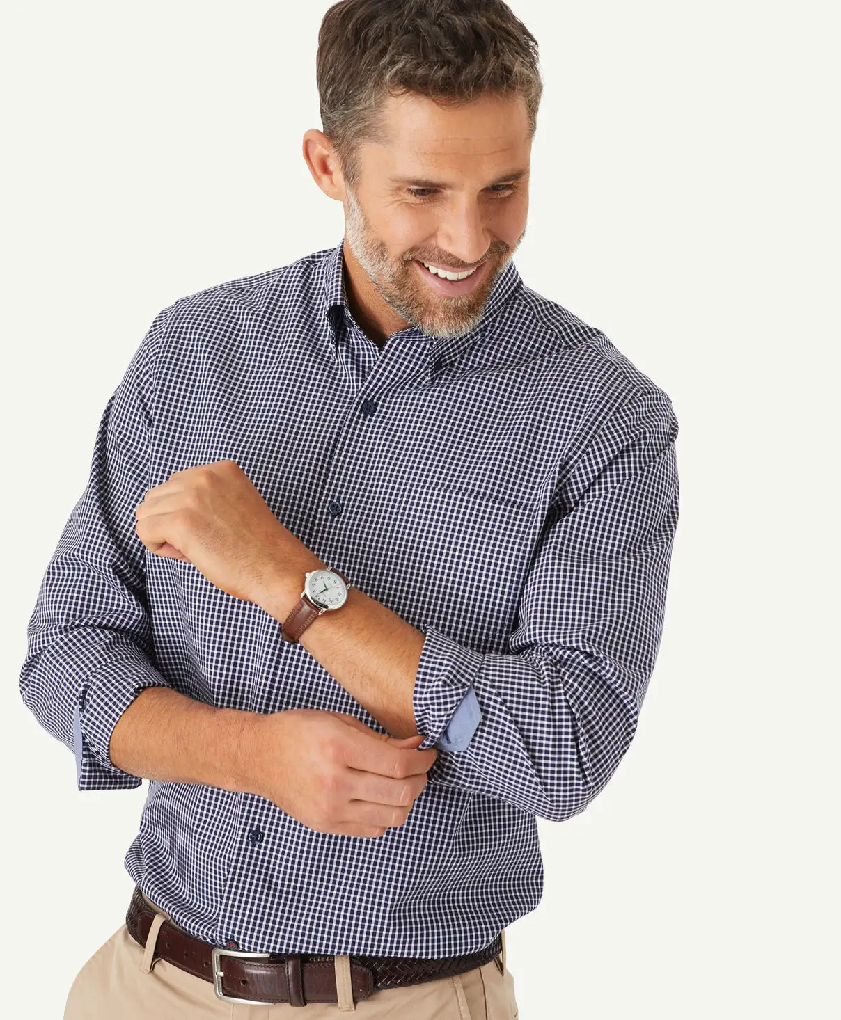 An update for your spring wardrobe, this navy and white check shirt stands out from the crowd thanks to its navy buttons and contrast cuff lining. Wear it together with light chinos and tan leather accessories for a fresh spring look.