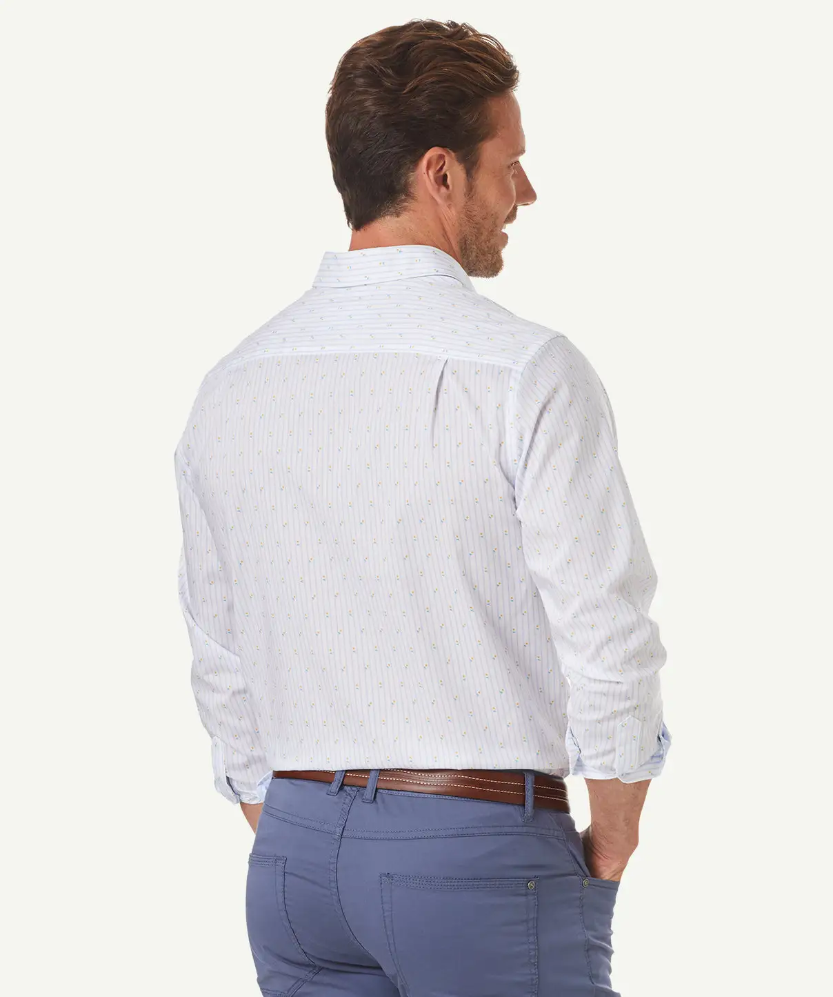 A subtle nod to spring florals, this white and blue stripe shirt adds a fun element to your wardrobe. Wear it together with blue chinos or shorts to embrace colour this season.