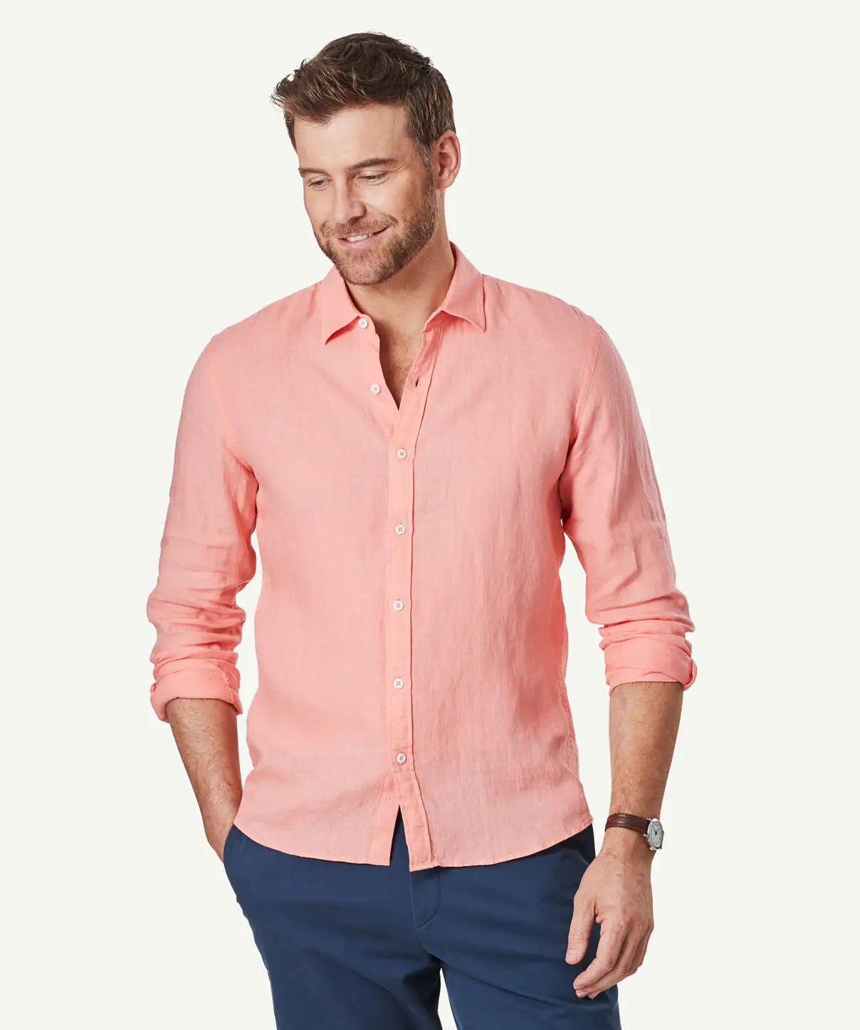 This soft washed linen shirt is extremely lightweight, breathable and comfortable. The Linen Plain shirt is cut in a tailored fit for a smart look and constructed from natural fibers for extra comfort. Available in five easy to style colours.